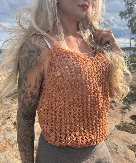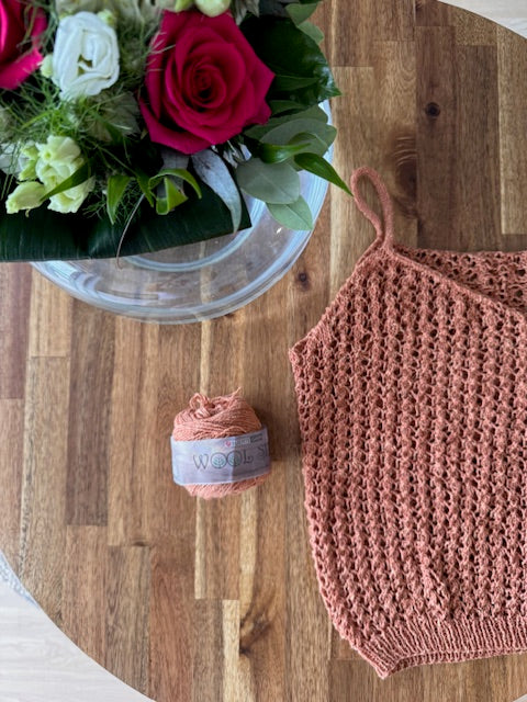 Toppi neulotaan alhaalta ylöspäin saumattomasti kädenteihin saakka, jonka jälkeen etu -ja takakappale neulotaan erikseen tasoina. Naru olkaimet ja v-aukollinen pääntie.
