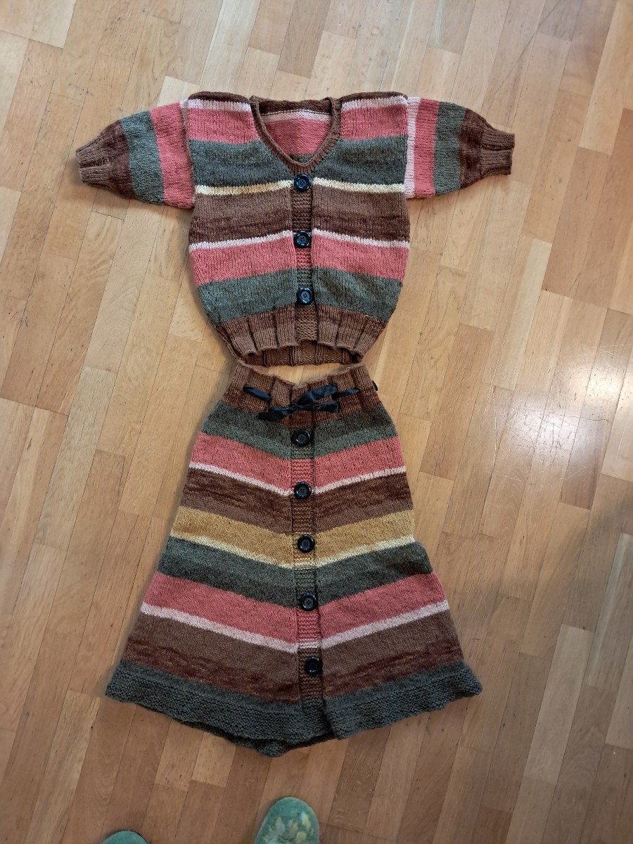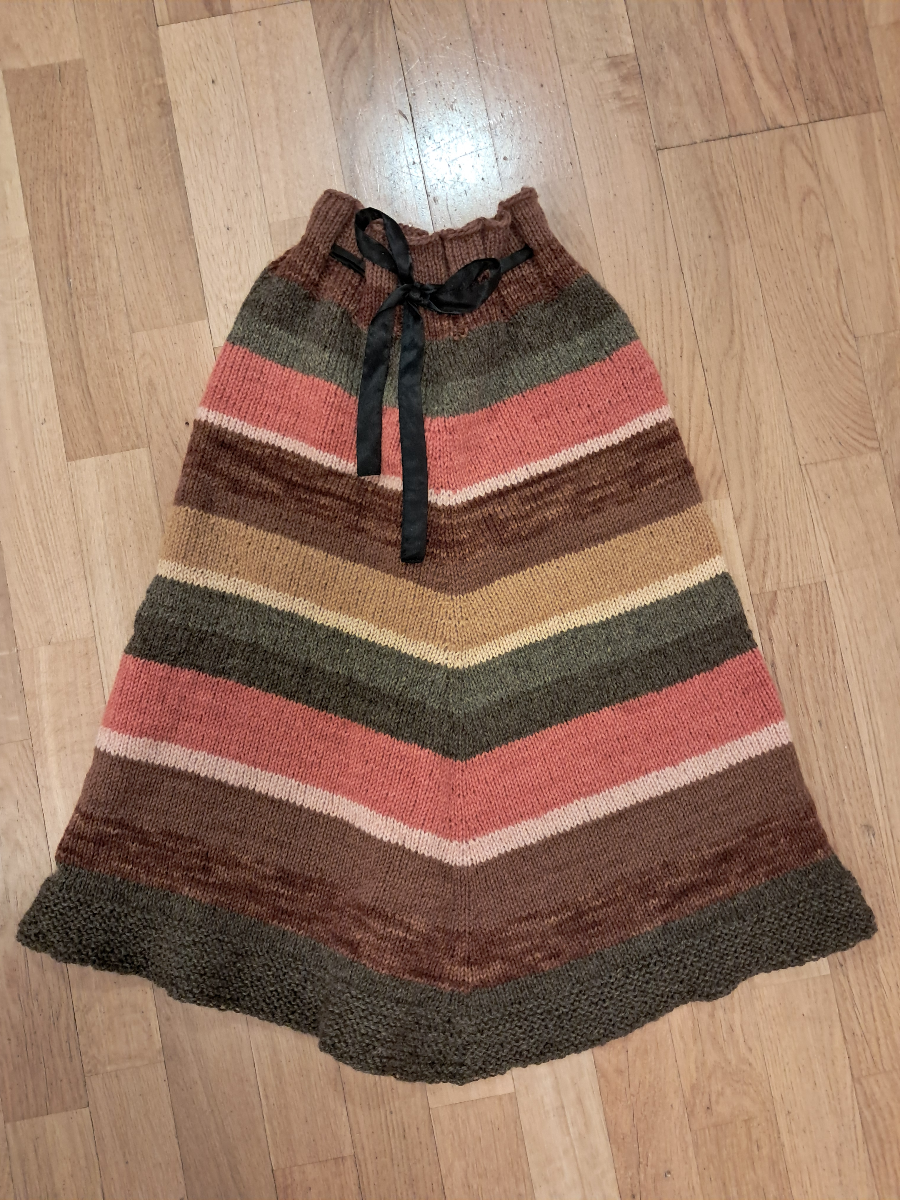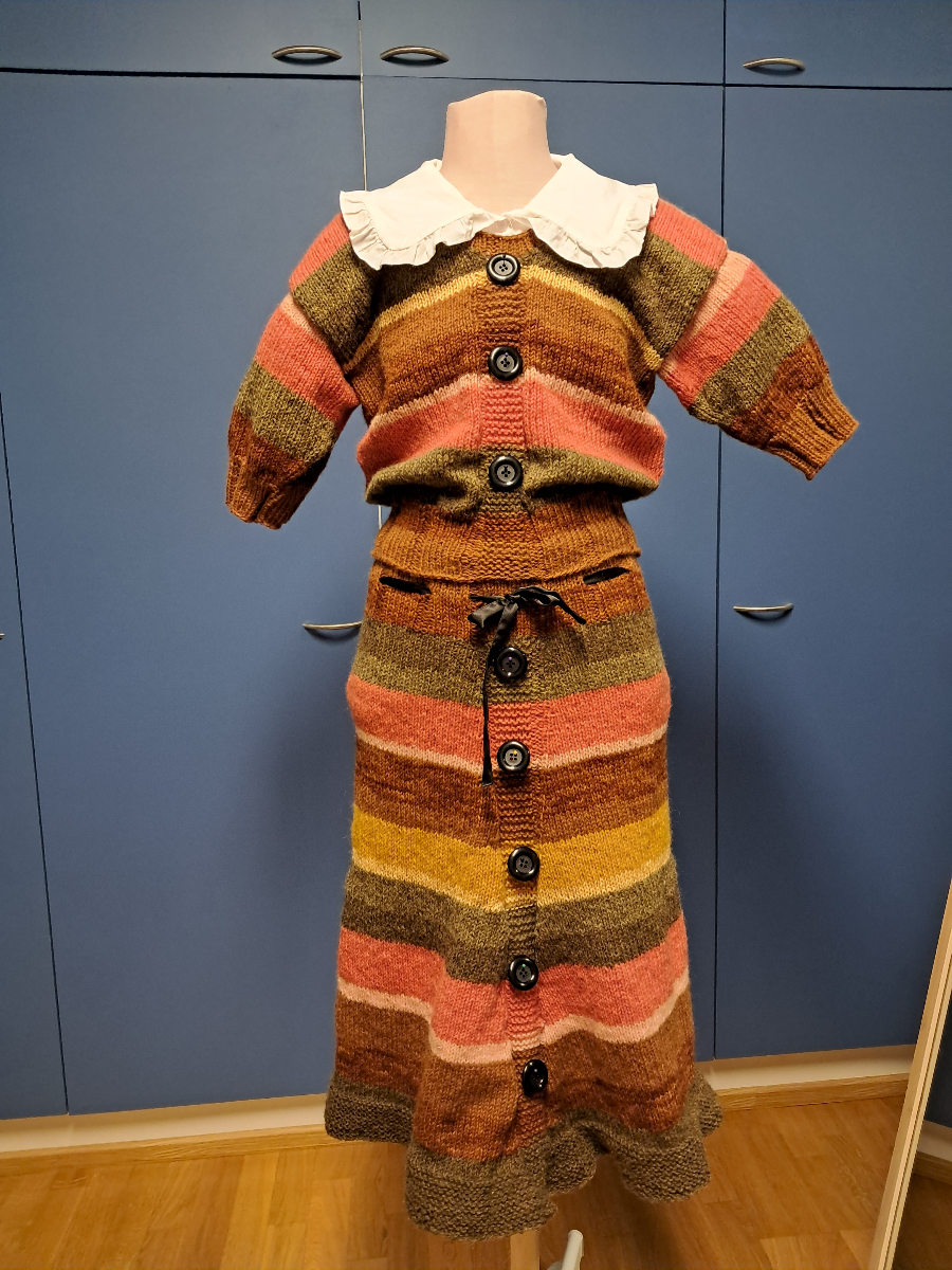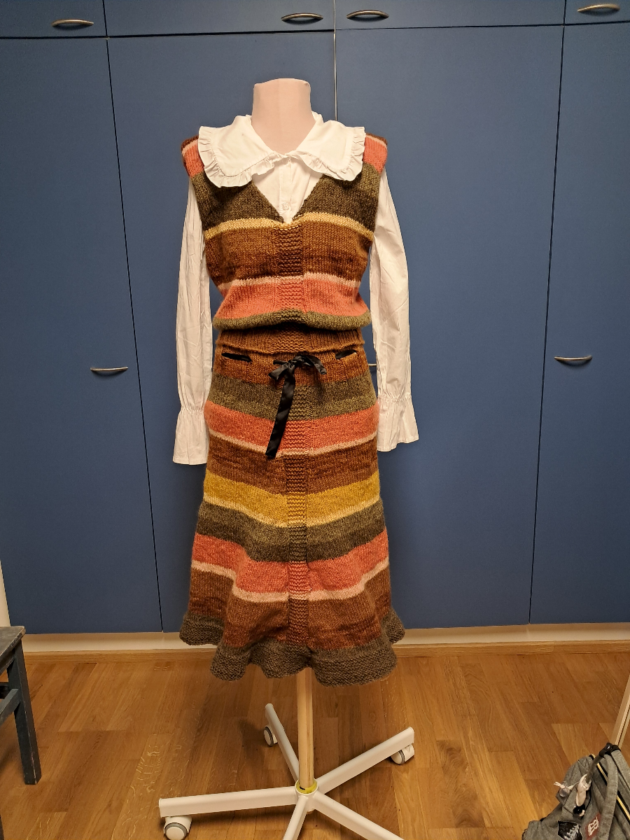 Lanka: Pirtin kehräämön 3-säikeinen lanka, 400-450 g hame ja 300-350 g toppi. Langaksi sopii kaikki Aran vahvuiset langat esim. Sandnes Garn Peer Gynt ja Novitan 7 Veljestä langat.