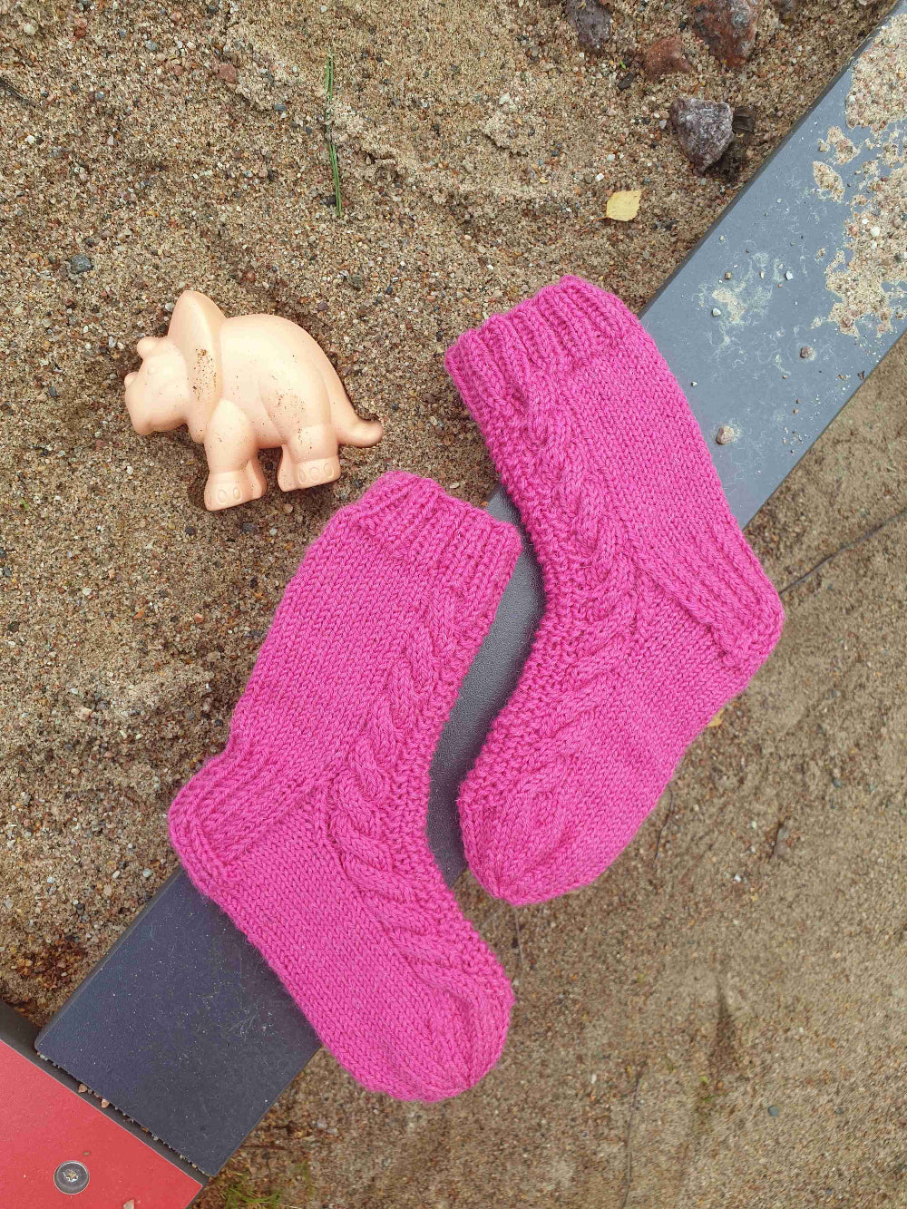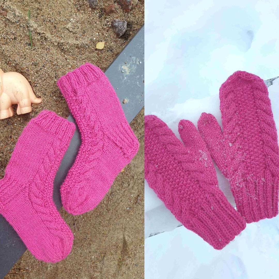 Koko: Palmikkosukkien koko on noin 26/27, mutta jalkaosaa voi neuloa lapsen jalan koon mukaan esimerkiksi muutaman koon pidemmäksikin. Palmikkolapasten koko on lapsi / pieni koululainen, noin 6-9 -vuotias.