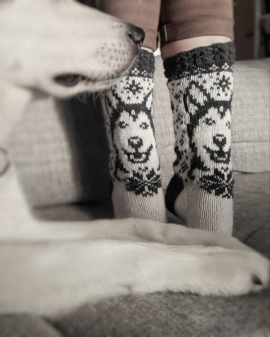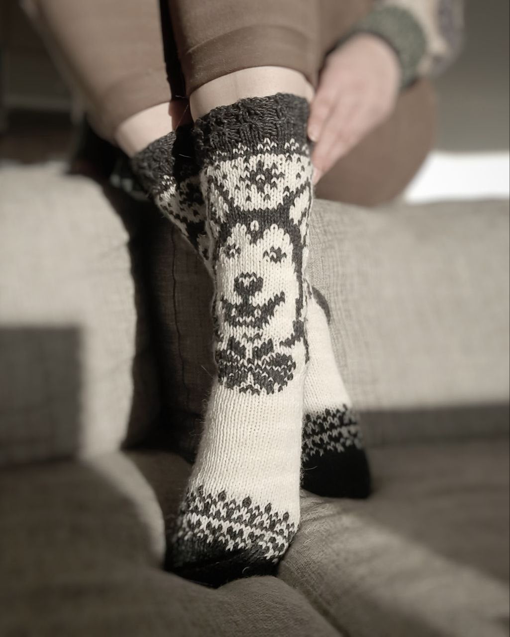 Njarga alaskanmalamuutti kirjoneulesukissa toteutetaan varren kuvio tikapuutekniikan avulla ja silmukointia hyödynnetään jalkaterässä.