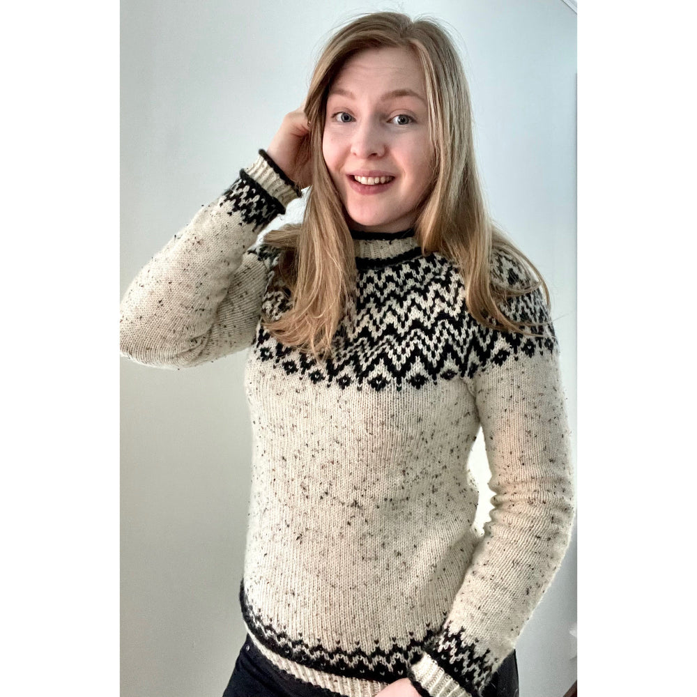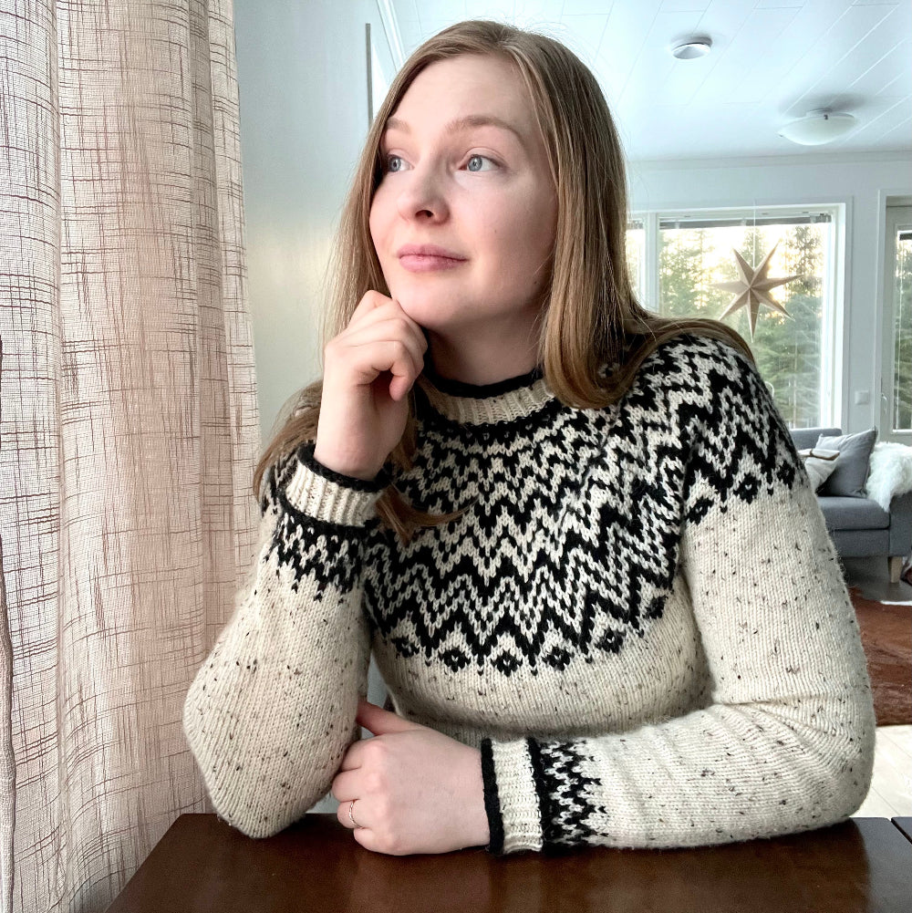 Vaikeusaste: Helppo (perinteinen kirjoneule, eikä sisällä kovin pitkiä langankuljetuksia ja Max. 2 väriä yhtä aikaa työssä)