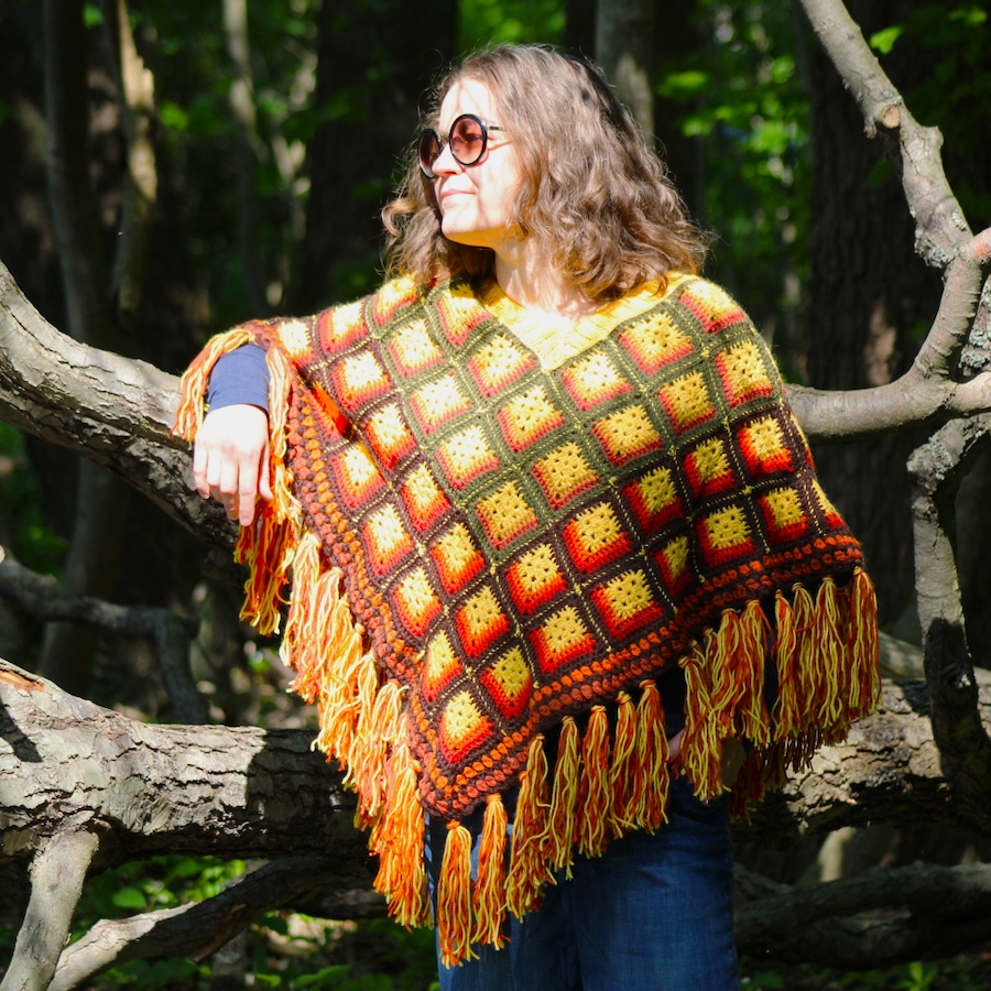 outono - syksy. Poncho virkataan osittain paloista, reunukseen virkaataan nyppyraitoja ja lopuksi neulotaan kaulus. Ohjeessa on paljon kuvia, joissa on näytetty vaihe vaiheelta sekä neliöpalan, että nyppyreunuksen virkkaus.