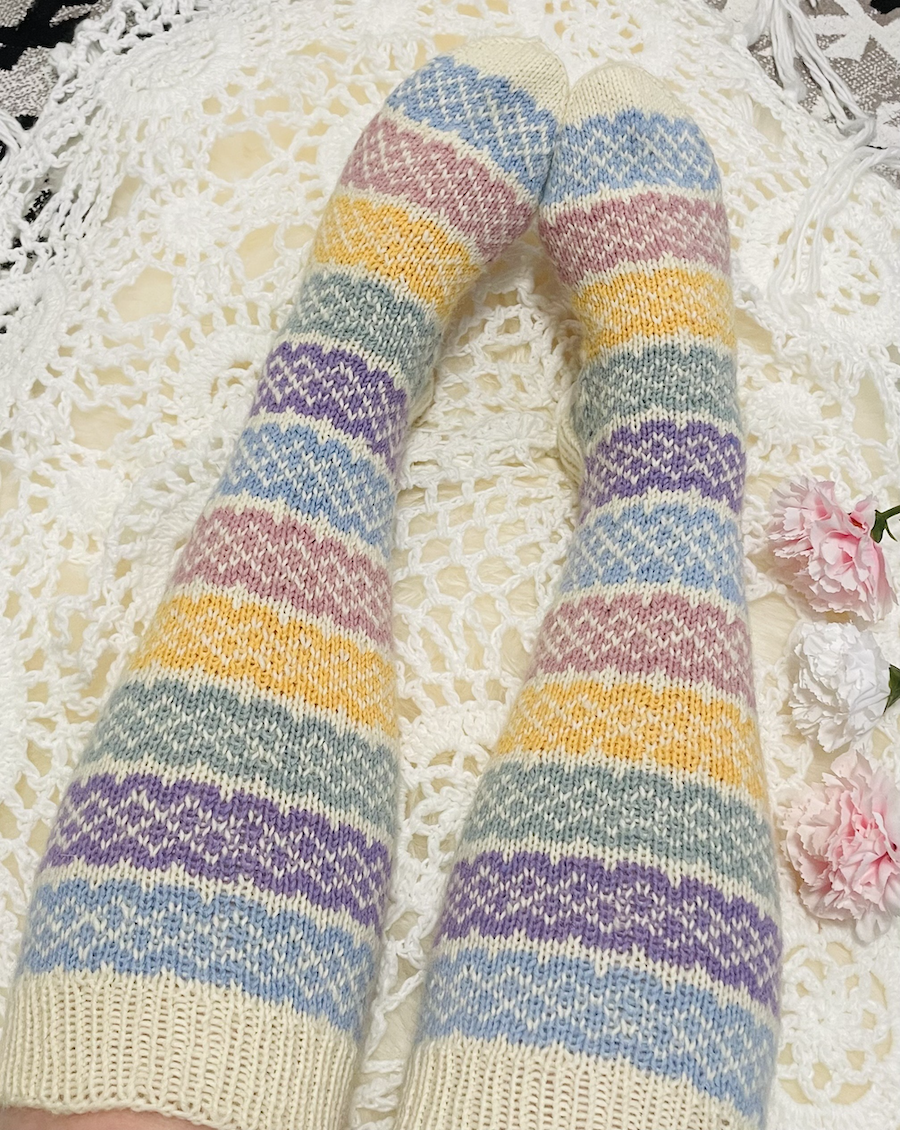 Herkän kauniit, pastellisävyiset pitkät villasukat pakkaspäiviin, vaikka hankikävelylle! Näihin voi myös käyttää varastoissa lojuvia lankanyssyköitä.