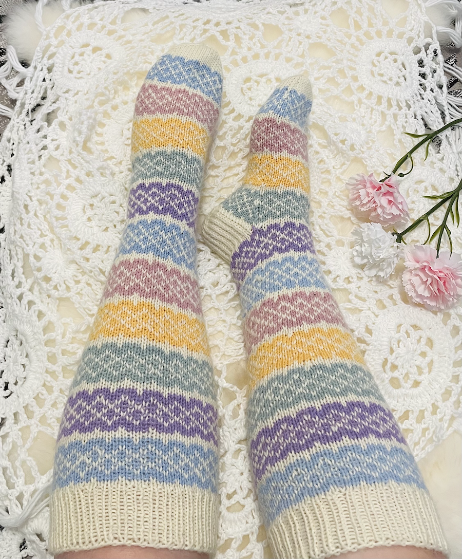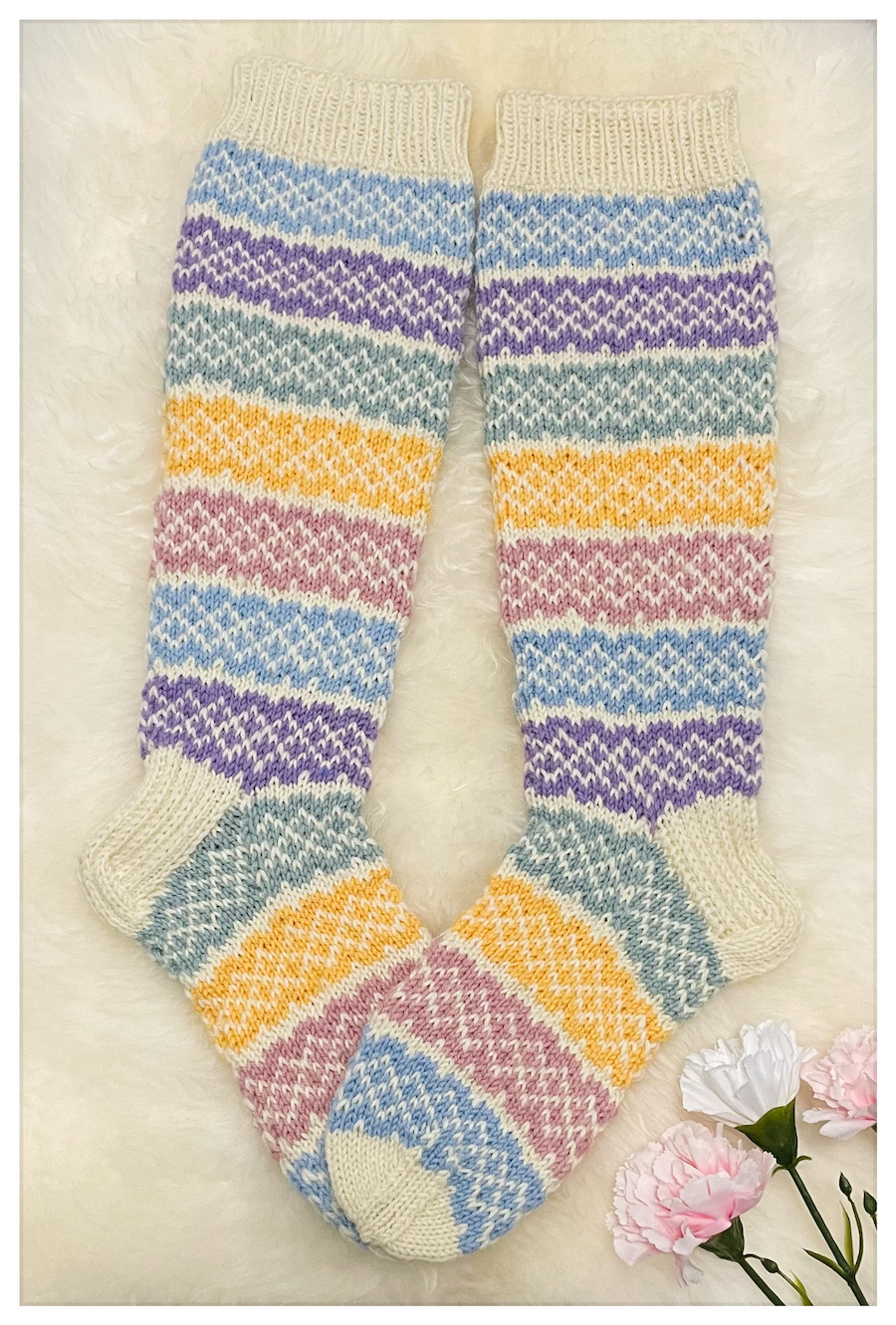 Pastellipitsi-kirjoneulesukat, neuleohje (kuvat: Irene Pöytäsaari)