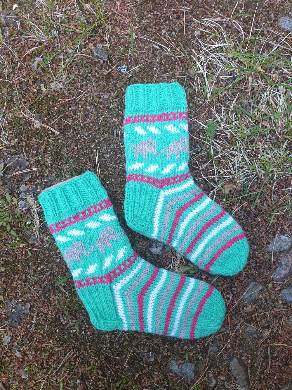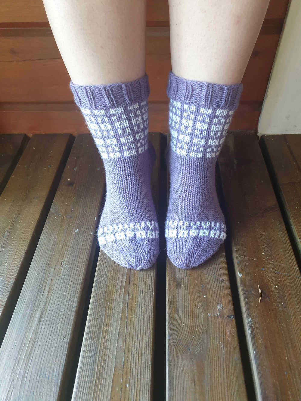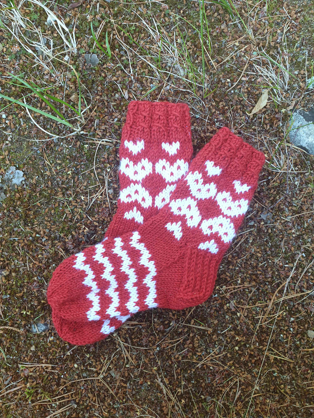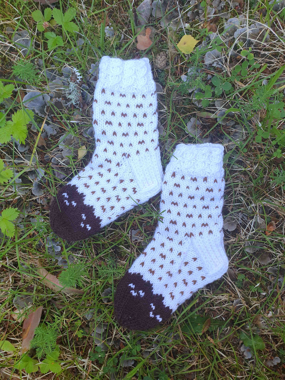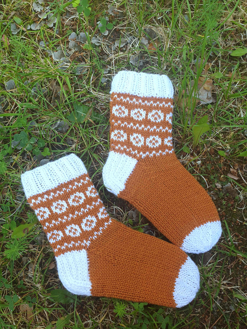 Tässä pienessä e-neuleohjekirjasessa on 6 mallia, joista kahdessa mallissa on myös aikuisen koot. E-neuleohjekirjanen sisältää lasten kirjoneulevillasukkien ohjeita, joissa neljässä mallissa on yksi koko ja kahdessa mallissa on kaksi kokoa. Koko antaa kuitenkin myöden myös mainitun koon ympäriltä viereiset koot, sillä jalkaosaa voi neuloa useassa mallissa lapsen jalan koon mukaan neulomalla mallikaaviota / raitoja / sileää neuletta ohjeessa mainittua enemmän tai vähemmän. Ohjeet ovat normaalia kirjoneuletasoa, joissain malleissa saattaa olla hetkittäin pidempiä langanjuoksuja, mutta monessa mallissa jalkaosa on sileää neuletta tai raitoja. Kaikki ohjeet on suunniteltu 100 g = 200 m vahvuisille langoille. Kuvan mallisukat on neulottu 3,5 sukkapuikoilla ja Novita 7 veljestä langoilla.