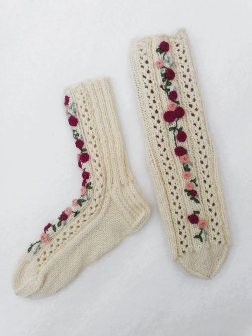 Vaikeusaste: Normaali, ruusut kirjotaan valmiiseen sukkaan kuvallisten ohjeiden mukaan