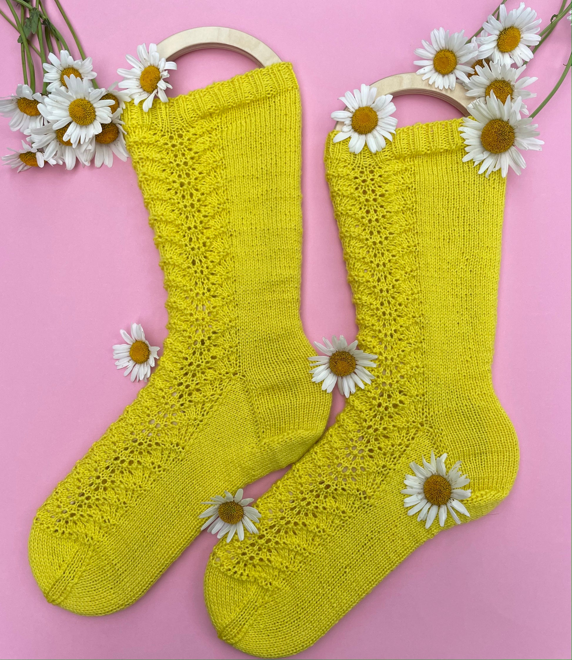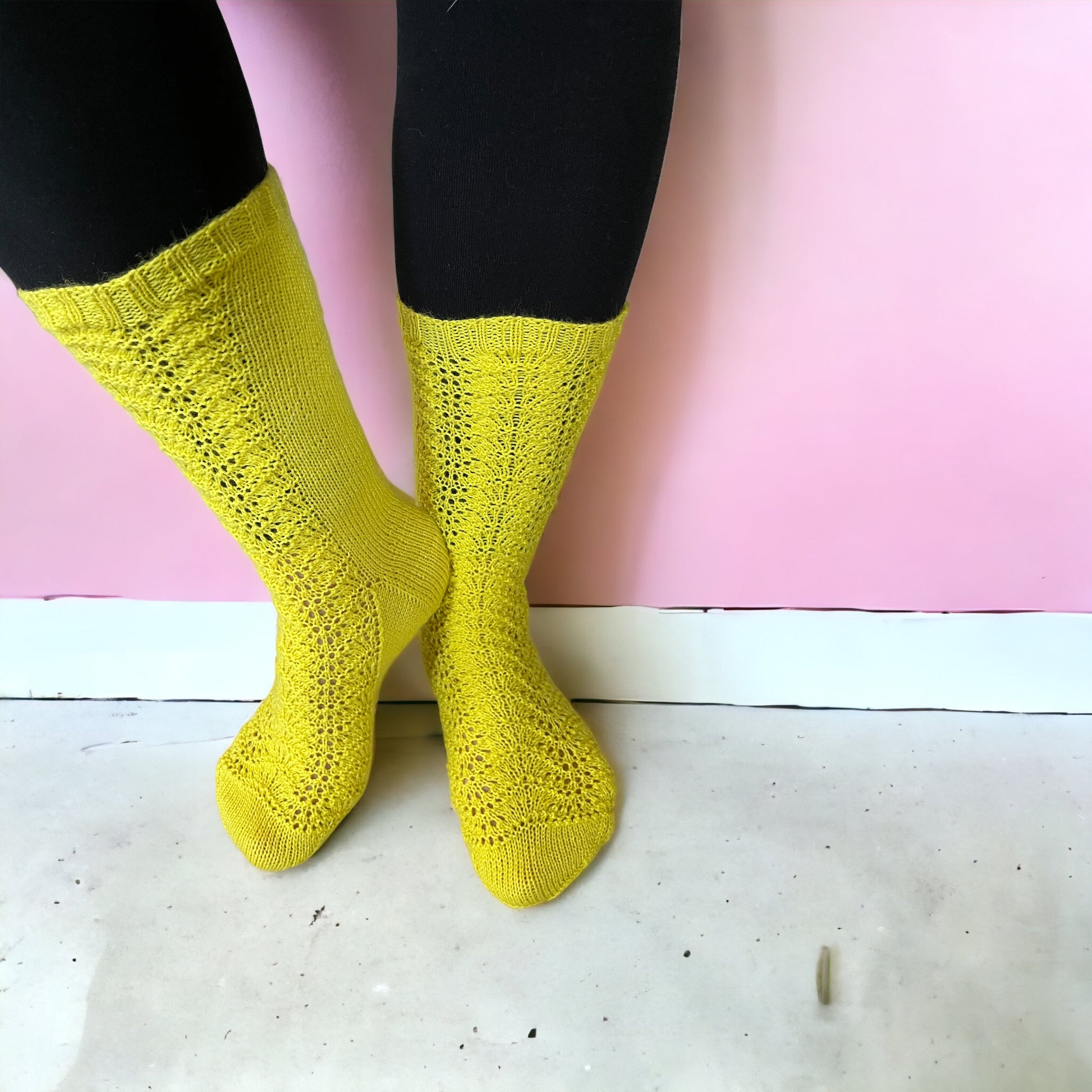 Lanka: Kuvan sukissa käytetty lanka on Filcolana Arwettaa värissä Electric Yellow (251). Voit käyttää myös muuta fingering vahvuista lankaa (n. 400m/100g)