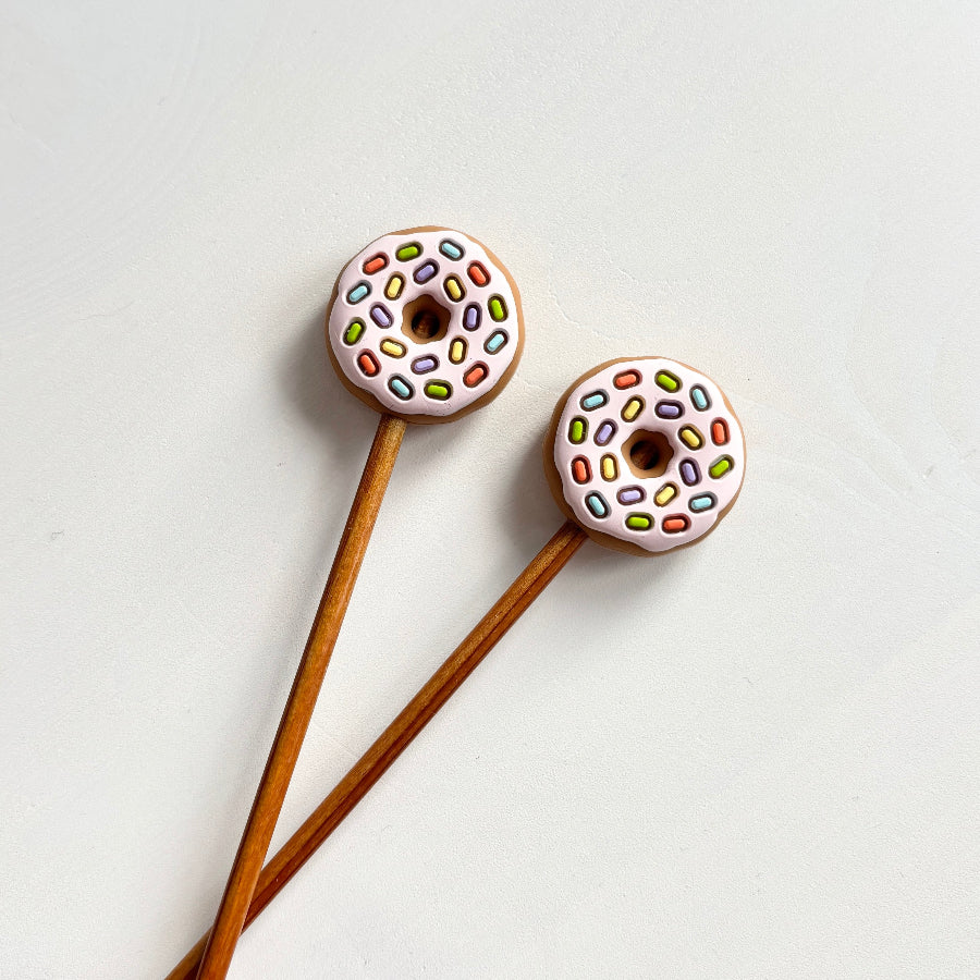 Pakkauksessa on 2 kpl ruskeita/vaaleanpunaisia donitseja. Sopivat koon 2.5 mm-9 mm puikkoihin.