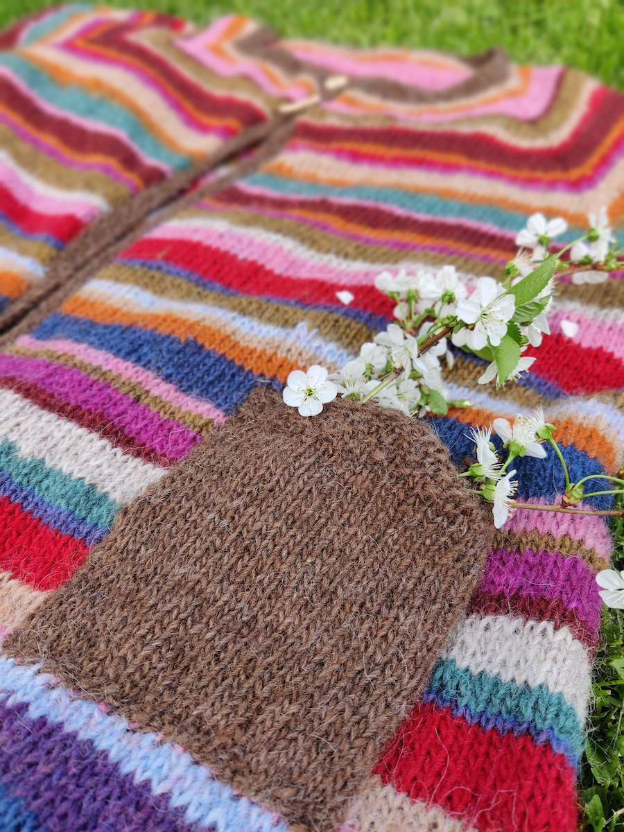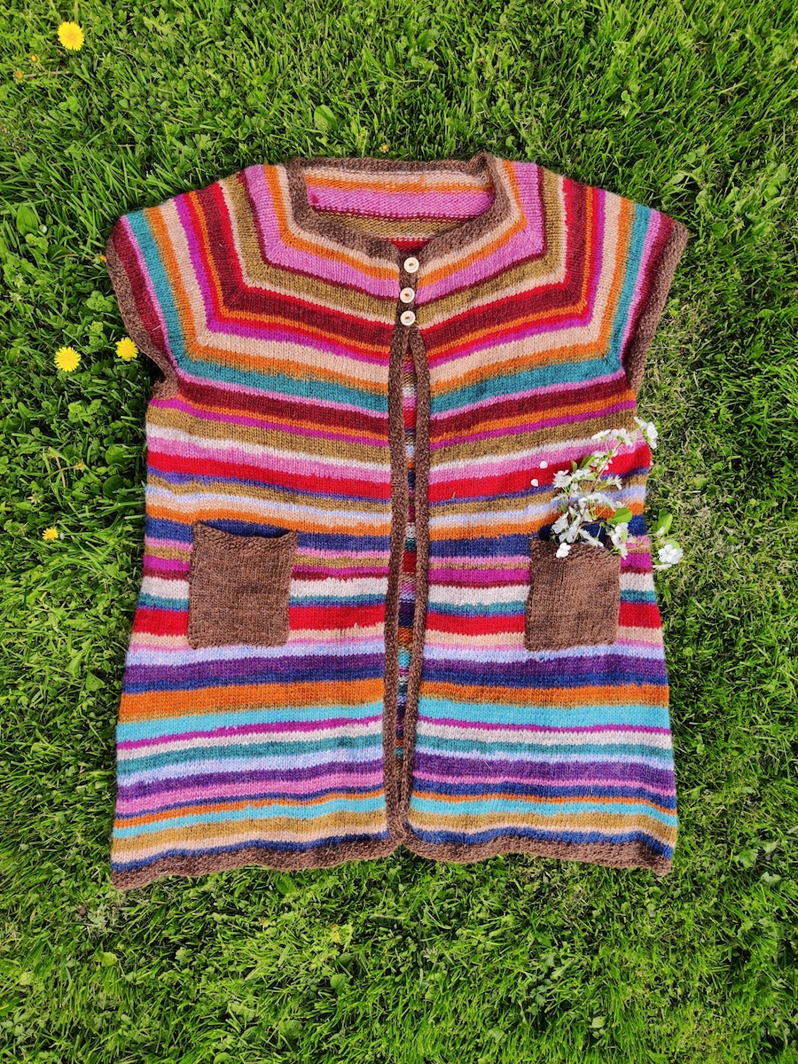 Rento ja väljä lyhythihainen villatakki. Sujahda aamutakin sisään kesäaamuna, kun varjot ovat vielä pitkiä ja maassa kastetta. Tähän saat upotettua yli 600g jämälankoja!