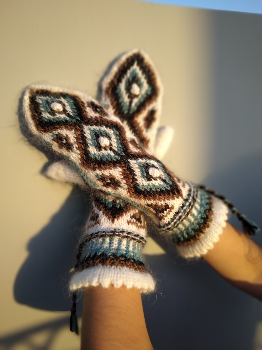 Huomio! Kuvan lapaset on neulottu Novitan värikartan vanhemmilla, jo myynnistä poistuneilla tummanruskean ja petroolin väreillä, joten ohjeeseen on päivitetty tähän hetkeen (syksy/talvi 2025) malliin sopivimmat, saatavilla olevat värivaihtoehdot.