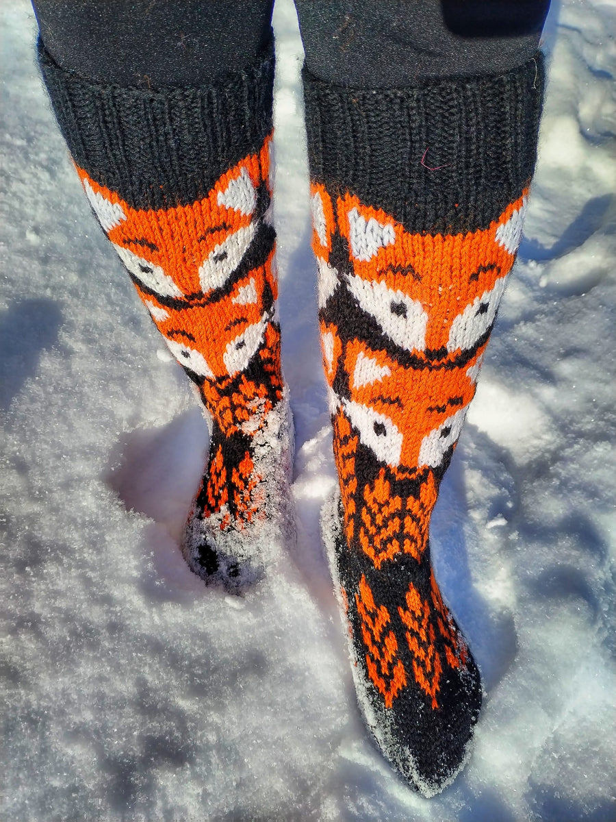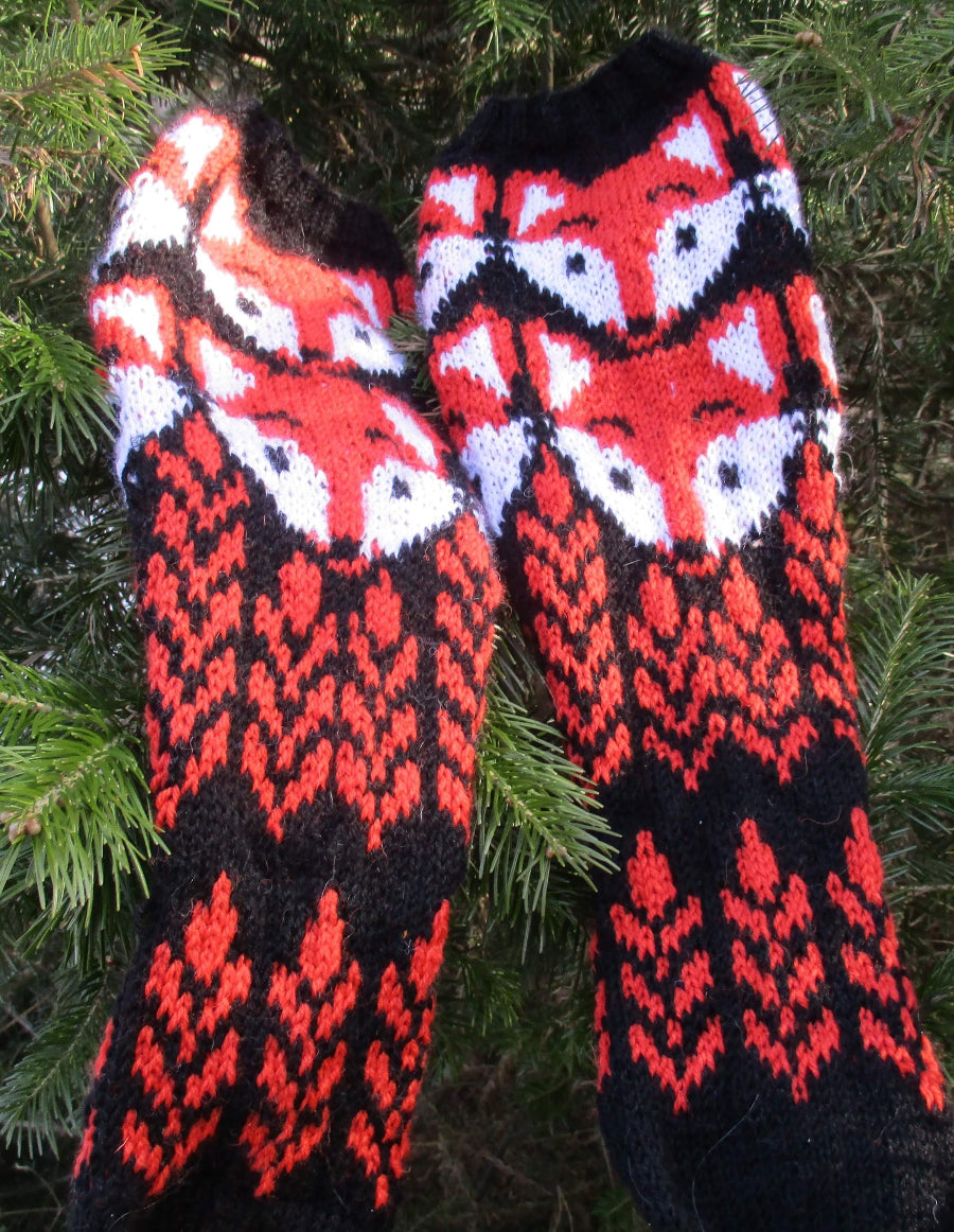 Vaikeusaste: Haastava varren osuudelta; pitkiä langankuljetuksia ja kolme eriväristä lankaa yhtä aikaa työssä (valkoiset kohdat voi myös silmukoida valmiiseen työhön)