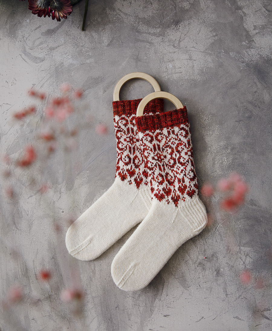 Ohuesta langasta neulotut sukat sopivat hyvin myös kenkiin. Puna-valkoiset riemukkaat