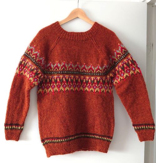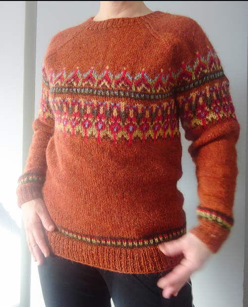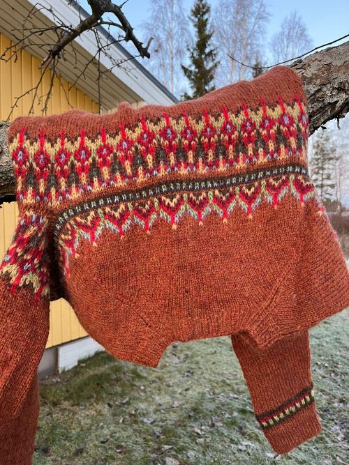 Vaikeusaste: Normaali (Ei pitkiä langanjuoksuja, max. 4 väriä samalla kierroksella, ei silmukointia, raglan kavennukset, sanalliset ohjeet ja kaaviot)