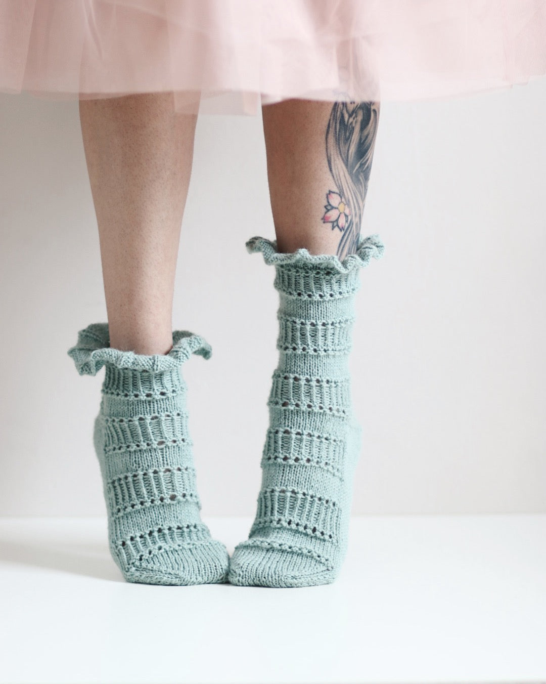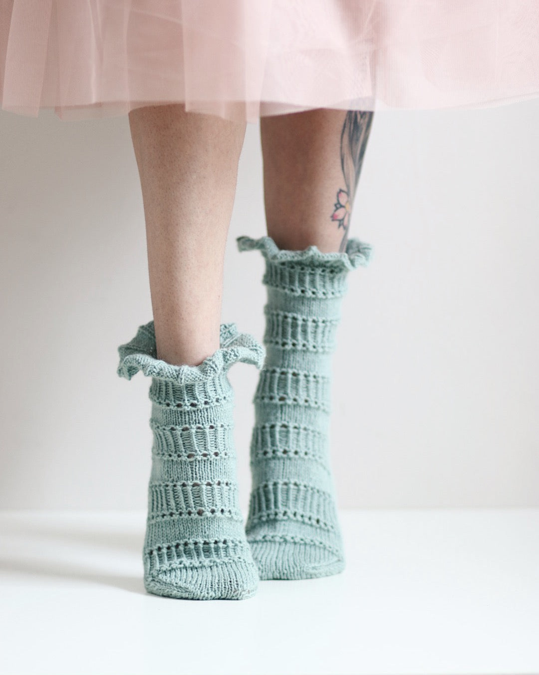Söpöillään röyhelösukilla! Sukat neulotaan varresta varpaisiin.