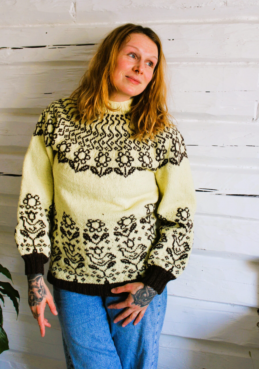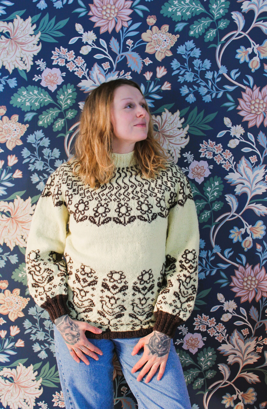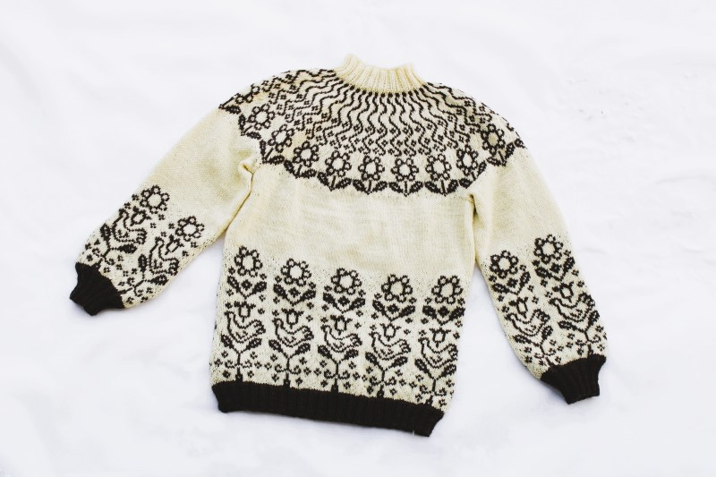 Niin hihoissa kuin vartalossakin toistuu lintu- ja kukkakuviot vaikkakin ne ovat hyvin erilaiset, kuin Esterin Sirkku astiasarjassa ja esiintyvät tässä kaarrokeneuleessa neulesuunnittelijan oman näkemyksen mukaisesti.