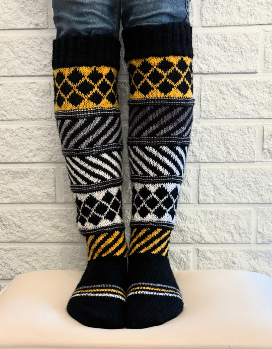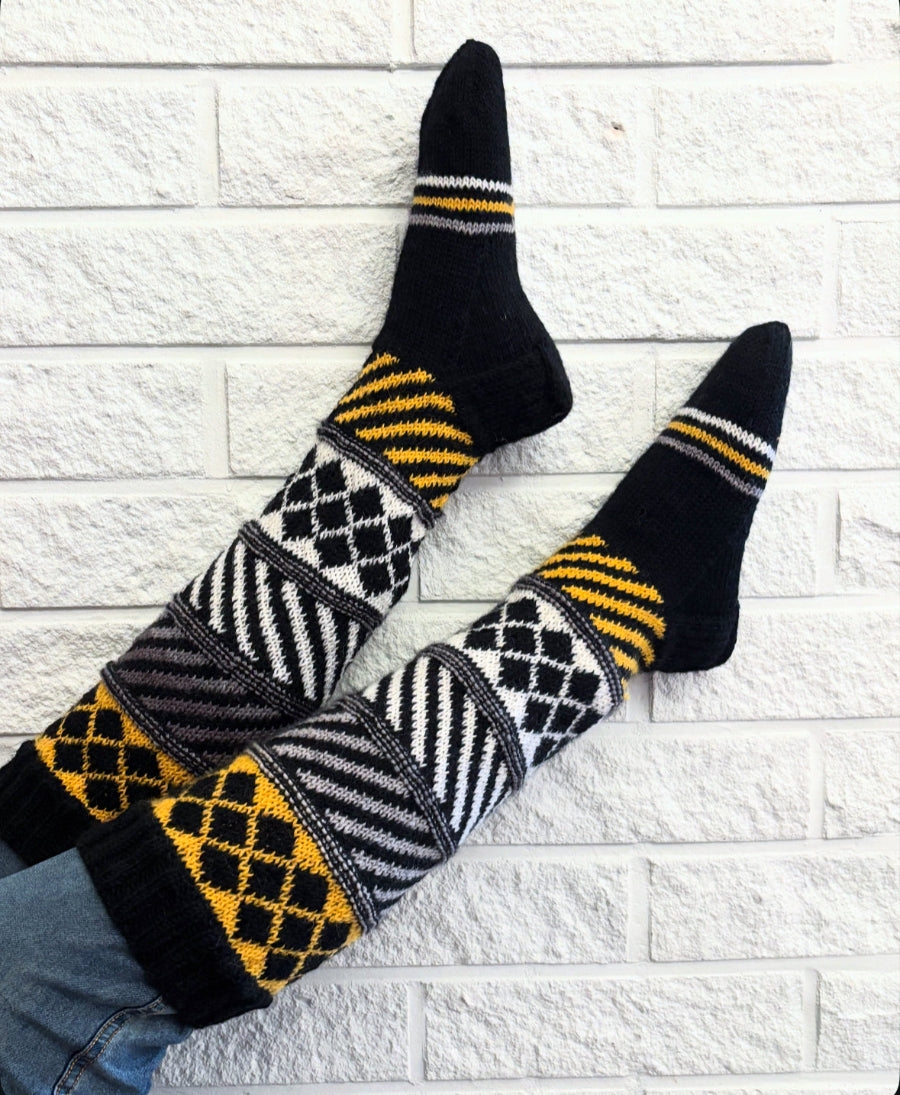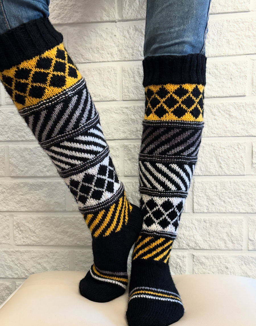 Polvipituiset kirjoneulesukat, joissa yhdistyvät mustavalkoinen graafisuus ja pirteä keltainen sävy. Näyttävät ja herkulliset!