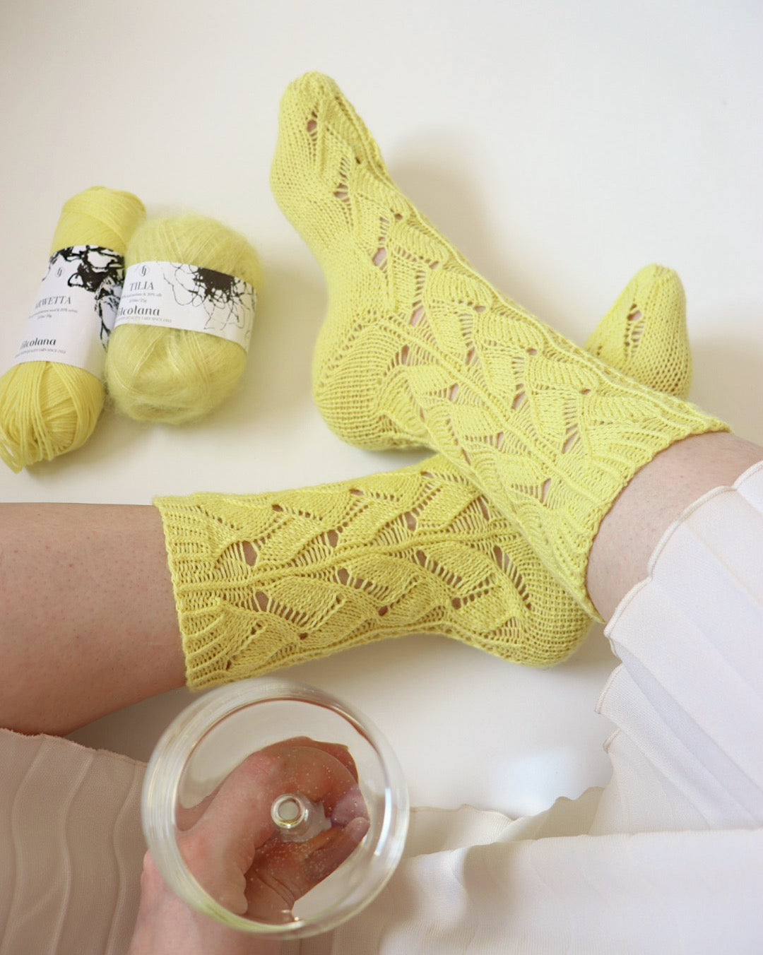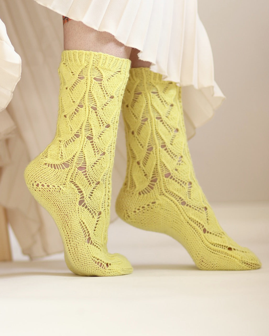 Sunshine-sukat neulotaan varresta varpaisiin toistaen pitsikuviota varressa ja jalkapöydän päällä. Sunshine-sukat ovat täydelliset kesäillan sukkaset.