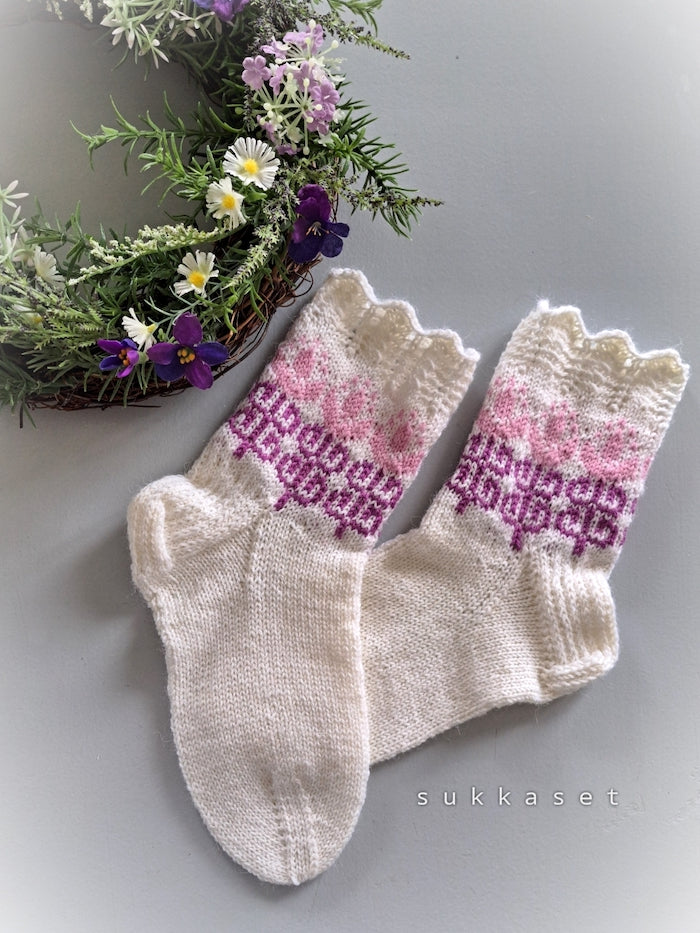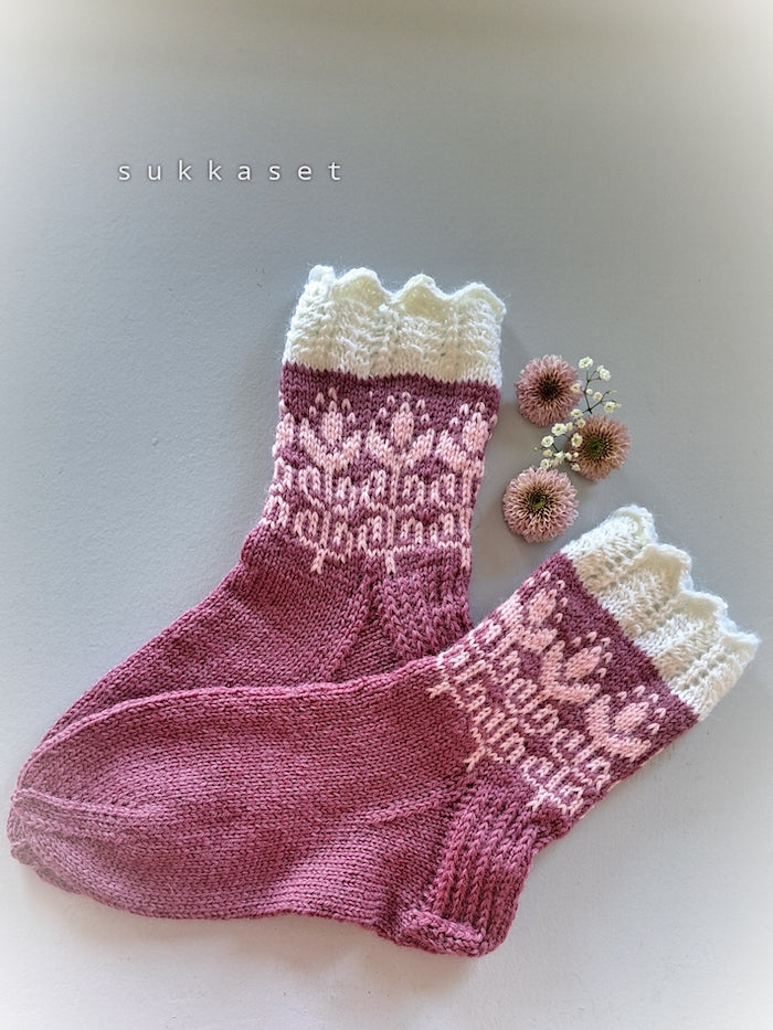 Romanttiset villasukat, kirjoneulekuvio varressa.