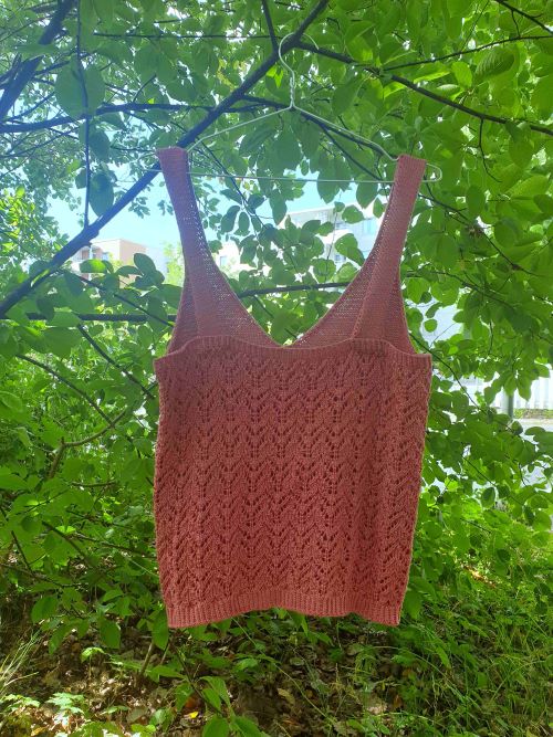 Soleado toppi neulotaan alhaalta ylöspäin yhtenä kappaleena kainaloihin asti ja sen jälkeen etuosa olkaimineen tasona. Olkaimet kiinnitetään ommellen pienin pistoin takaosaan. Topin etuosa on sileää neuletta ja takaosa on kaunista pitsineuletta.