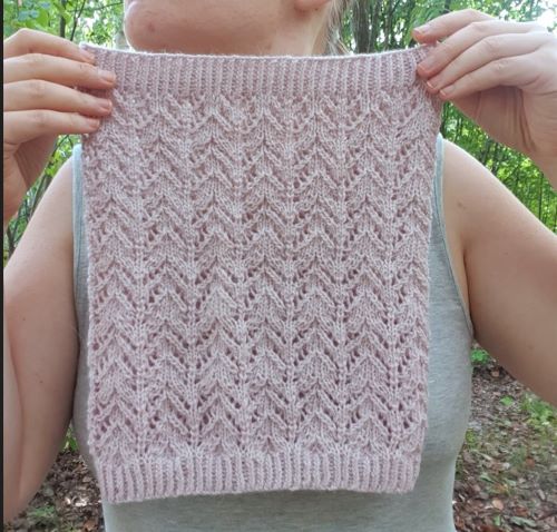 Tiheys: Joustineuleesta: 10 cm = 28 s, 10 cm = 30 krs, pitsineuleesta: 10 cm = 24 s, 10 cm = 35 krs