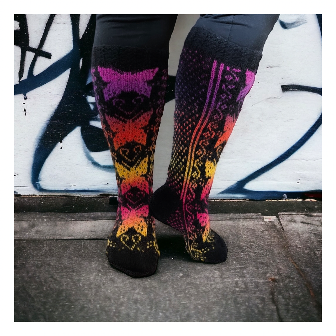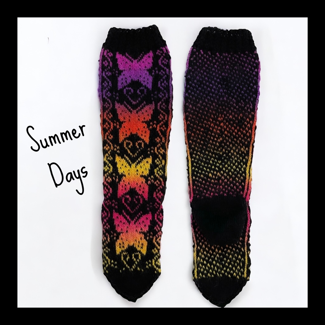 Summer Days- kirjoneulesukat ovat pitkät, näyttävät ja lämpimät sukat, joiden kaunis kuviointi ja perhoset tuovat tuulahduksen kesäpäivistä.
