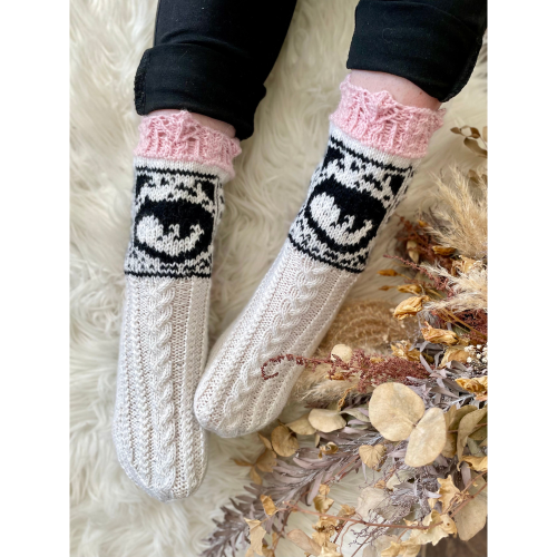Koko: Aikuinen nainen, sukan varren yläosassa 64s (ennen kirjoneuleen alkua 72s) kerroksella, jalkaterän pituus 38-40, pohkeen ympärys 37-40cm.