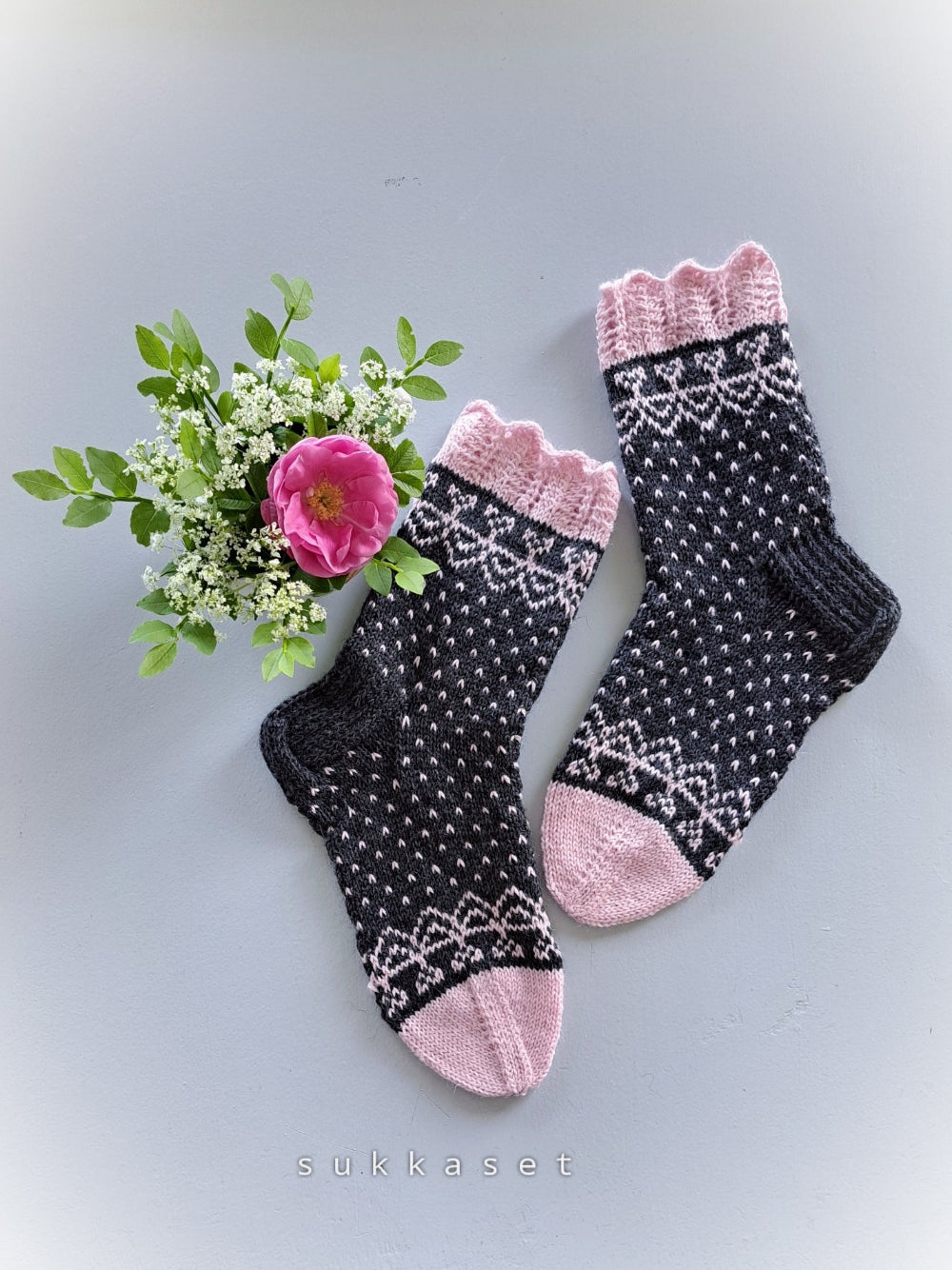 Romanttiset villasukat helpolla kirjoneukuviolla.