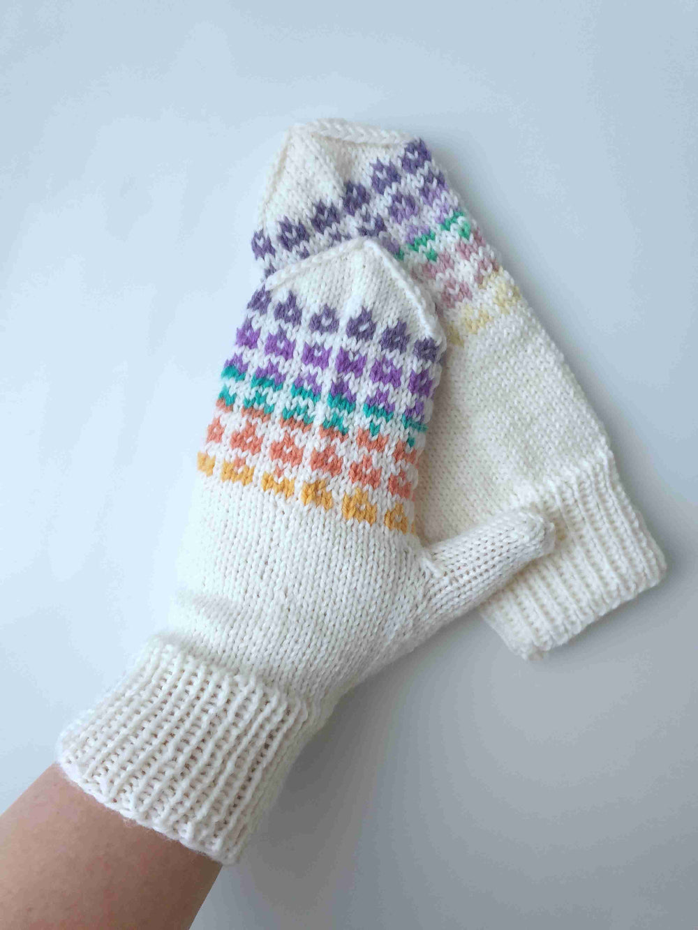 Jokaisen lapasparin saa neulottua yhdestä 100 g kerästä ja noin 50 g pohjaväristä. Vanilja-lapasiin varaa jämälankoja noin 10-20 g. Lisäksi tarvitset 3.5 mm tai käsialasi mukaiset sukkapuikot.. Mallilapaset on neulottu 3.5 mm sukkapuikoilla. Lapaset neulotaan varresta kärkeen.