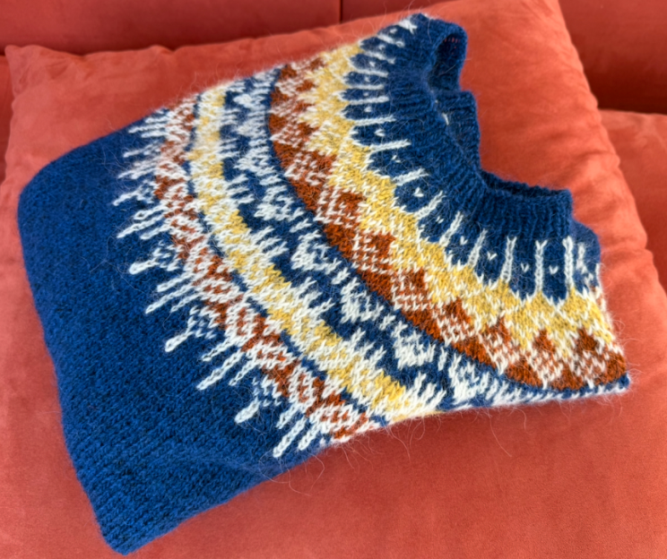 Neulotaan alhaalta ylös, pääosin kahdella värillä, muutama rivi kolmella.