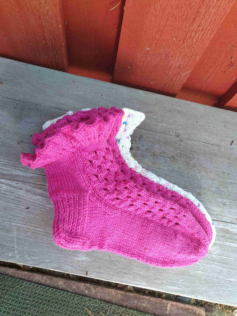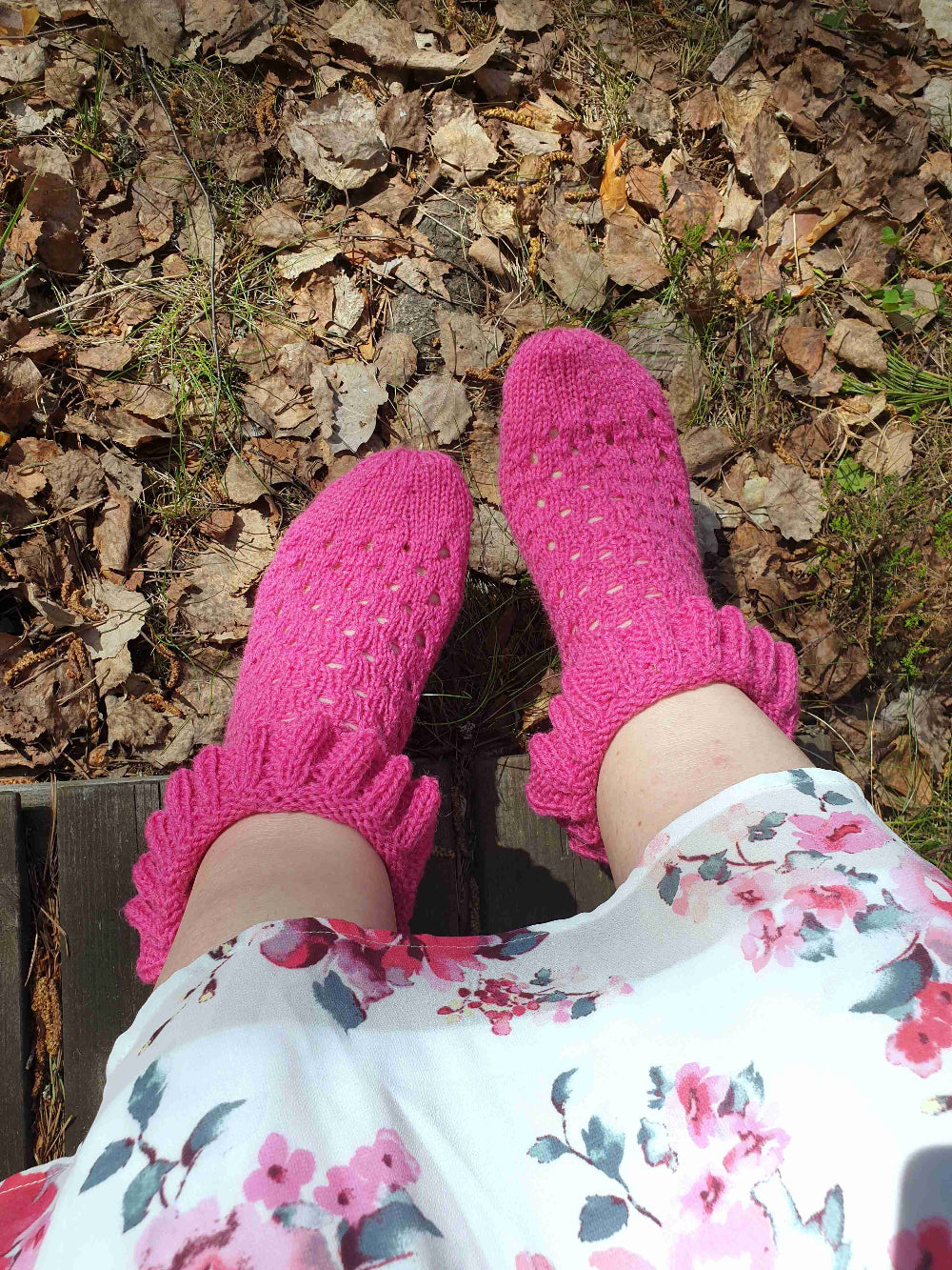 Nämä sukat ovat nimensä mukaisesti Väripilkut. Neulo nämä joko kirjavalla langalla kuten Freija Yarnin merino DK sukkalangalla tai kirkkaalla värillä, niin saat kivat väripilkkusukat. Sukissa on helppoa pitsiä ja niiden reunoissa kiertää palmikot. Helppo röyhelö viimeistelee kesälookin.
