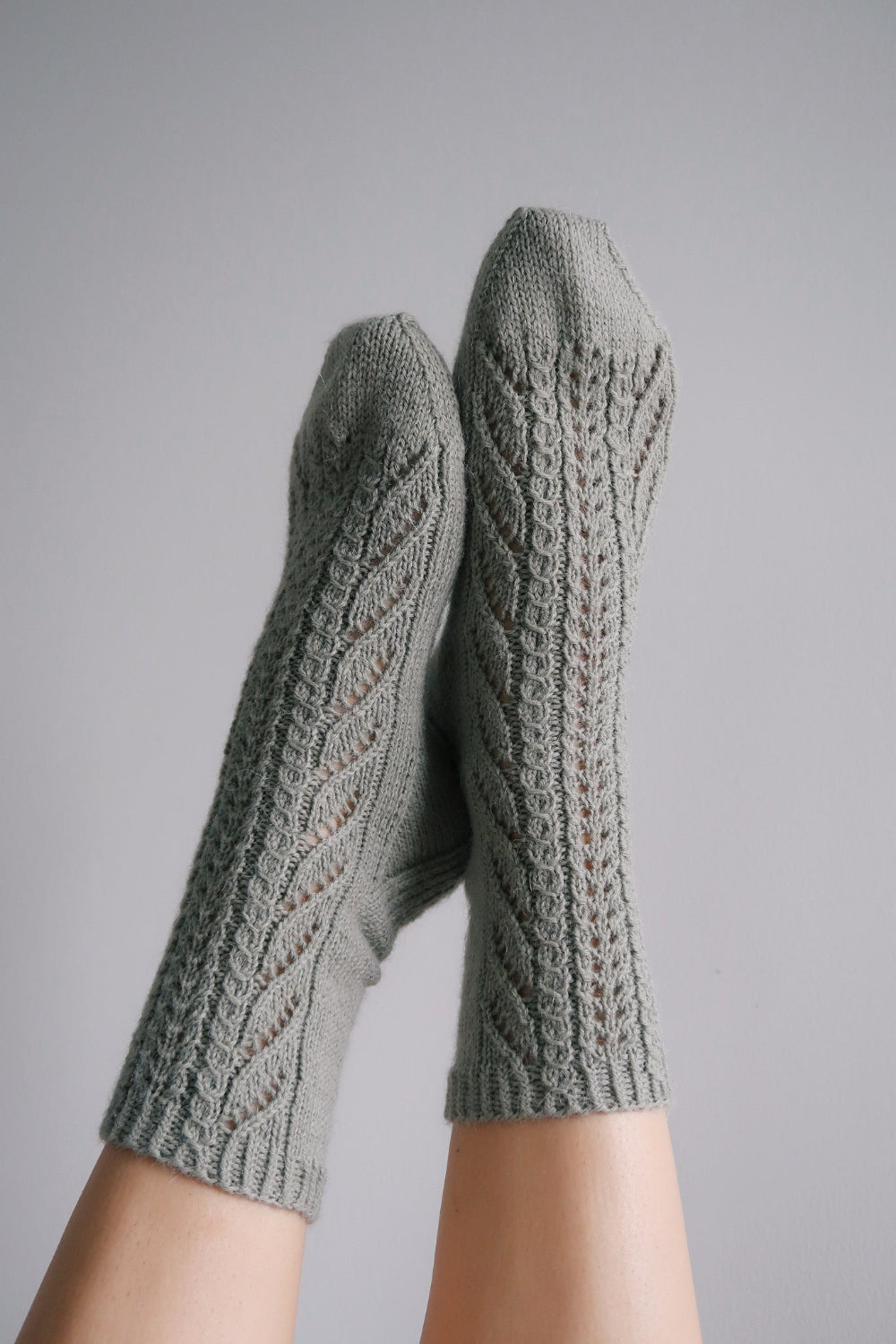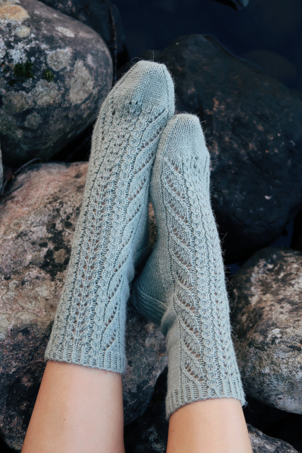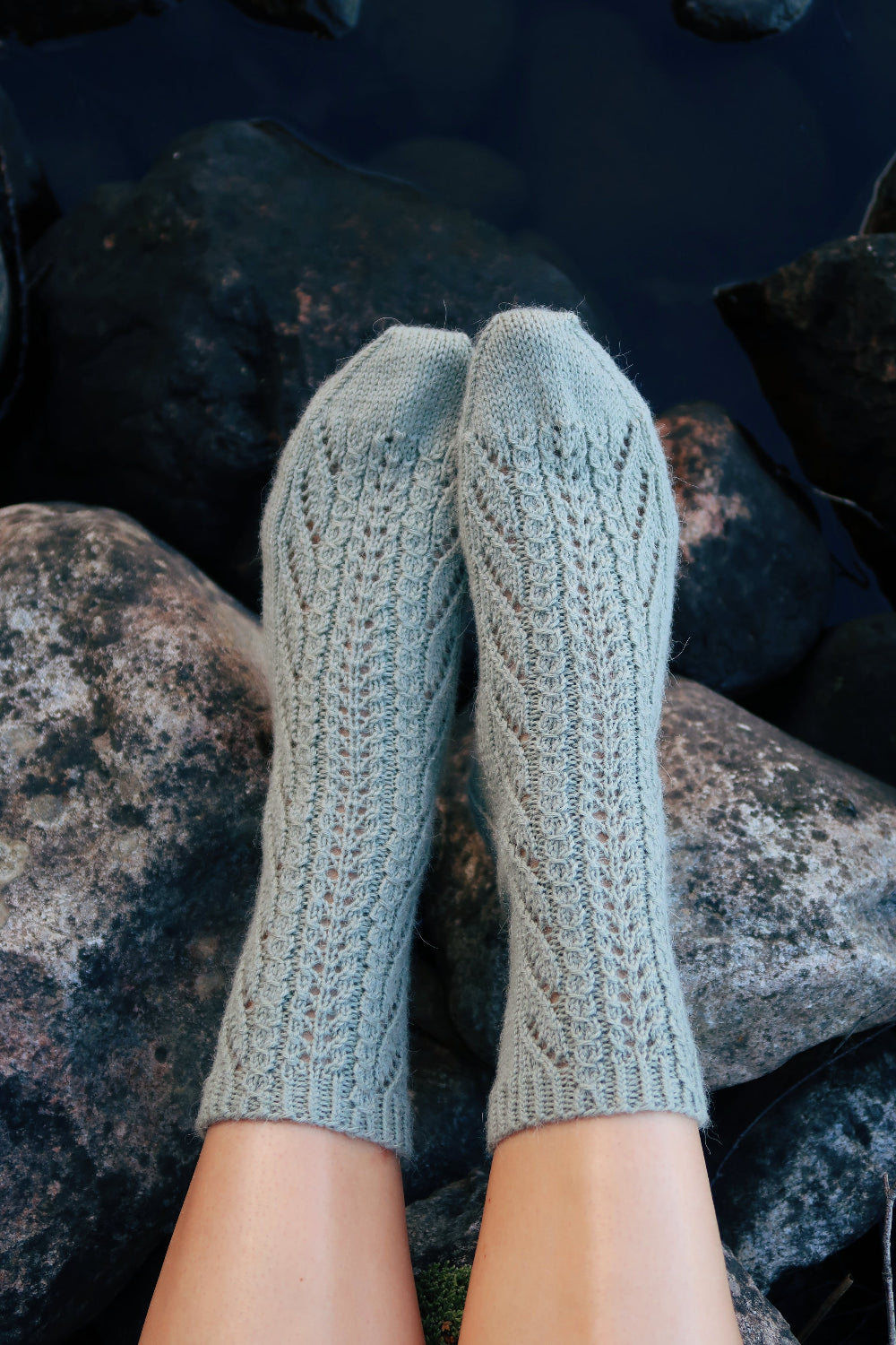Sukkien pitsikuvio on herkkä ja kaunis. Lyhyen mallikerran ansiosta sukkia on helppo ja mukava neuloa. Mallikerran oppii myös nopeasti muistamaan ulkoa. Sukat neulotaan varresta varpaisiin
