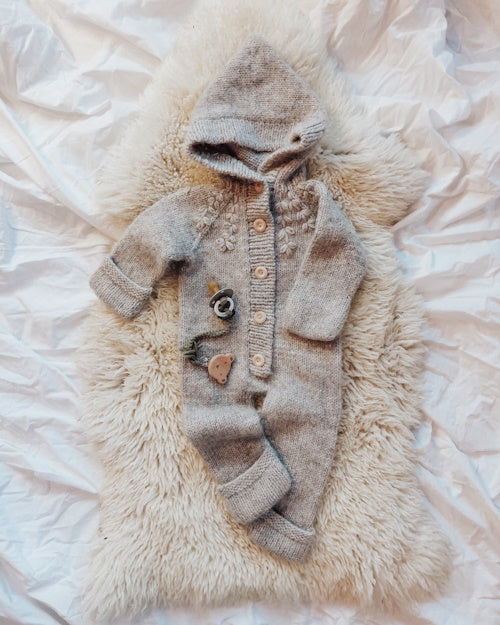 Haalari neulotaan yhtenä kappaleena alhaalta ylös. Ensin neulotaan hihat ja lahkeet, sitten lahkeet yhdistetään samalle puikolle ja neulotaan vartalo-osa kainaloihin asti. Hihat liitetään mukaan ja kaarroke neulotaan raglankavennuksilla. Sitten neulotaan huppu ja lopuksi poimitaan etureunoista ja hupun reunasta silmukat joustinneulereunusta ja nappilistoja varten. Halutessaan haalarin voi viimeistellä kirjomalla kaarrokkeeseen samalla langalla. Ohjeesta löydät videolinkin ja kuvallisia ohjeita pariin erilaiseen kirjontaan. Muihinkin erikoistekniikoihin on videolinkit, esim. italialaiseen luomiseen ja päättelyyn, ja osa työvaiheista on selostettu kuvilla. Ohje sopii siis myös aloittelijoille!
