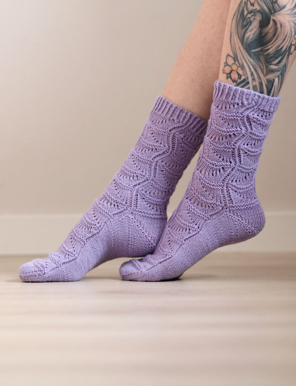 Viola-sukat neulotaan varresta varpaisiin toistaen pitsikuviota varressa ja jalkapöydän päällä. Viola-sukat ovat täydelliset kesäillan sukkaset.
