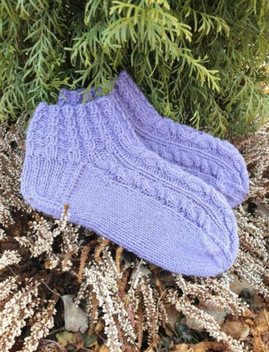 Aamuyö - aikuisen lyhytvartiset palmikkosukat ovat näyttävät palmikkosukat, ja lyhytvartisuuden ansiosta myös nopeat neuloa. Palmikot eivät ole vaikeita, mutta palmikon kiertoja on jonkin verran. Palmikot ovat kuitenkin toistuvia ja toisaalta aloittelijankin saattaa olla helppo tarttua lyhytvartiseen malliin. Sukkiin riittää yksi 100 g kerä Novita Seitsemän veljestä lankaa.